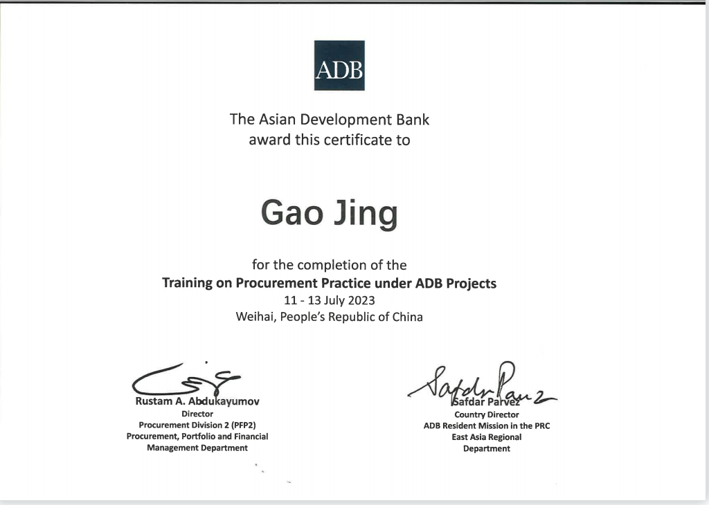 此次培訓重點對亞行采購政策、合同管理與合同計劃、亞行財務盡職分析要求、項目會計核算、項目財務報表、項目審計等主題進行授課。通過演講、案例研究、小組討論、結(jié)業(yè)測試及經(jīng)驗豐富的執(zhí)行機構(gòu)分享經(jīng)驗等方式使參訓人員加深了解亞行貸款采購、財務政策/規(guī)定并拓展實踐知識。甘肅文旅集團國際金融組織貸款項目管理辦公室一名同志代表亞行貸款甘肅環(huán)境可持續(xù)鄉(xiāng)村振興與發(fā)展項目作了大會交流發(fā)言,分享了項目管理工作中的經(jīng)驗和關注點。培訓授課結(jié)束,三名參訓人員獲得了結(jié)業(yè)證書。