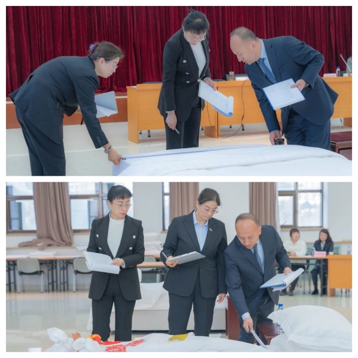 評委們認(rèn)真檢查選手做床完成情況,從鋪床準(zhǔn)備、操作規(guī)范等方面進(jìn)行綜合評判。