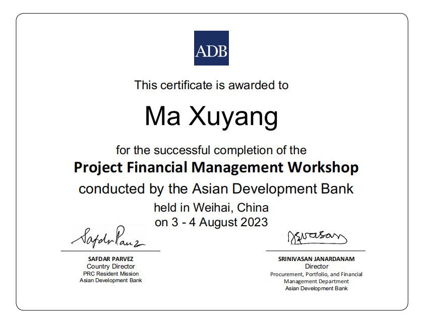 此次培訓重點對亞行采購政策、合同管理與合同計劃、亞行財務盡職分析要求、項目會計核算、項目財務報表、項目審計等主題進行授課。通過演講、案例研究、小組討論、結(jié)業(yè)測試及經(jīng)驗豐富的執(zhí)行機構(gòu)分享經(jīng)驗等方式使參訓人員加深了解亞行貸款采購、財務政策/規(guī)定并拓展實踐知識。甘肅文旅集團國際金融組織貸款項目管理辦公室一名同志代表亞行貸款甘肅環(huán)境可持續(xù)鄉(xiāng)村振興與發(fā)展項目作了大會交流發(fā)言,分享了項目管理工作中的經(jīng)驗和關注點。培訓授課結(jié)束,三名參訓人員獲得了結(jié)業(yè)證書。